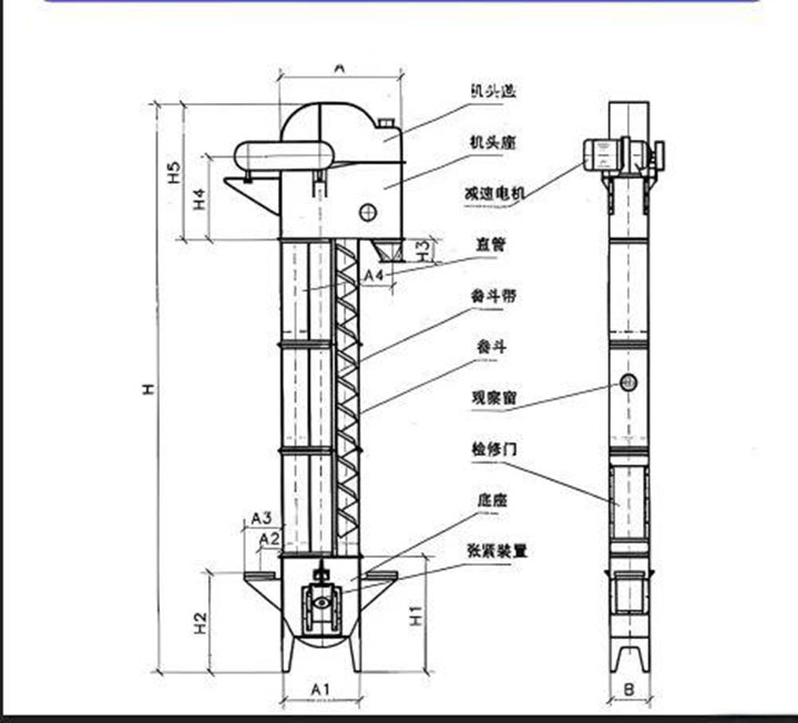 鏈斗式提升機(jī)主要由牽引構(gòu)件、料斗、驅(qū)動(dòng)裝置、頭輪、尾輪、機(jī)殼與張緊裝置組成。