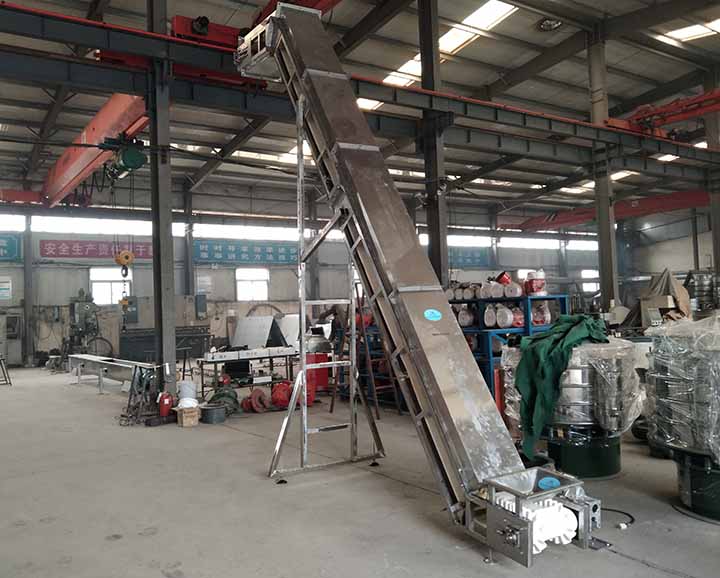 (1)大傾角皮帶輸送機(jī)的輸送傾角大,大可達(dá)90°,是大傾角輸送和垂直提升的理想設(shè)備。因此可以節(jié)約占地面積,節(jié)省設(shè)備投資和土建費(fèi)用,取得良好的綜合經(jīng)濟(jì)效益。例如,某用戶欲將煤炭提升到20m高的料倉(cāng)頂,如采用擋邊機(jī)以45°傾角輸送,則機(jī)長(zhǎng)僅需28.3m(水平機(jī)長(zhǎng)20m);而如果采用垂直輸送的擋邊機(jī),那么,水平機(jī)長(zhǎng)可以控制在6m以內(nèi)。