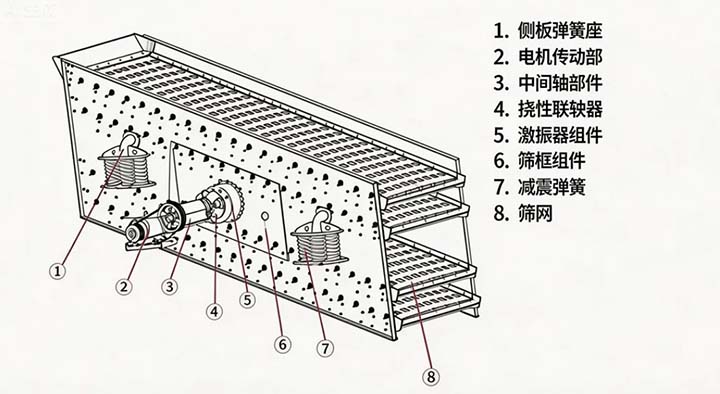 0715礦用重型振動篩采用振動電機(jī)做為激振源,調(diào)節(jié)振動電機(jī)激振力的大小,可以改變篩機(jī)的振幅。