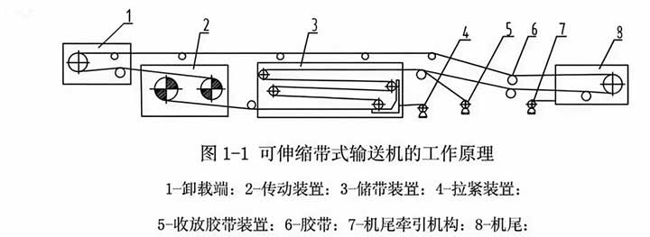 可伸皮帶輸送機與普通膠帶輸送機的工作原理一樣,是以膠帶作為牽引承載機的連續(xù)運輸設備,它與普通膠帶輸送機相比增加了儲帶裝置和收放膠帶裝置等,當游動小車向機尾一端移動時,膠帶進入儲帶裝置,機尾回縮;反之則機尾延伸,因而使輸送機具有可伸縮的性能。