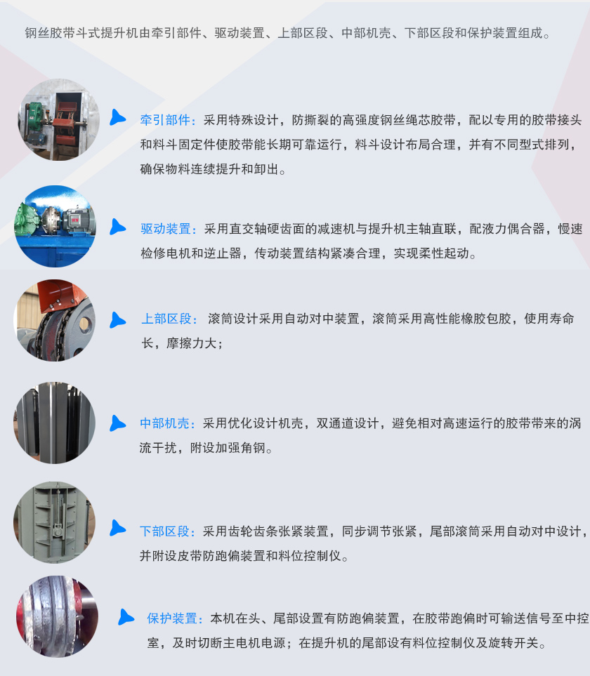 1、運行部件:采用特殊設計,帶防撕裂的高強度鋼絲繩芯膠帶,配以專用的膠帶接頭和料斗固定件使膠帶能長期可靠運行,料斗設計布局合理,并有不同型式排列,確保物料連續(xù)提升和卸出。
