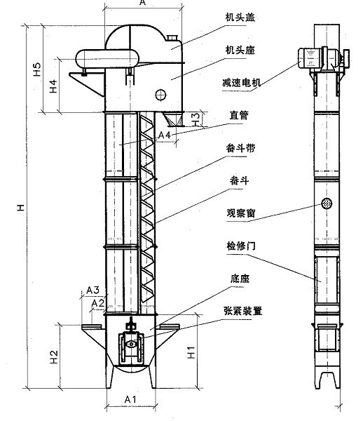 斗式提升機由上部區(qū)段、中部機殼、下部區(qū)段、帶料斗的輸送帶等牽引部件、傳動裝置和室外檢修平臺組成。